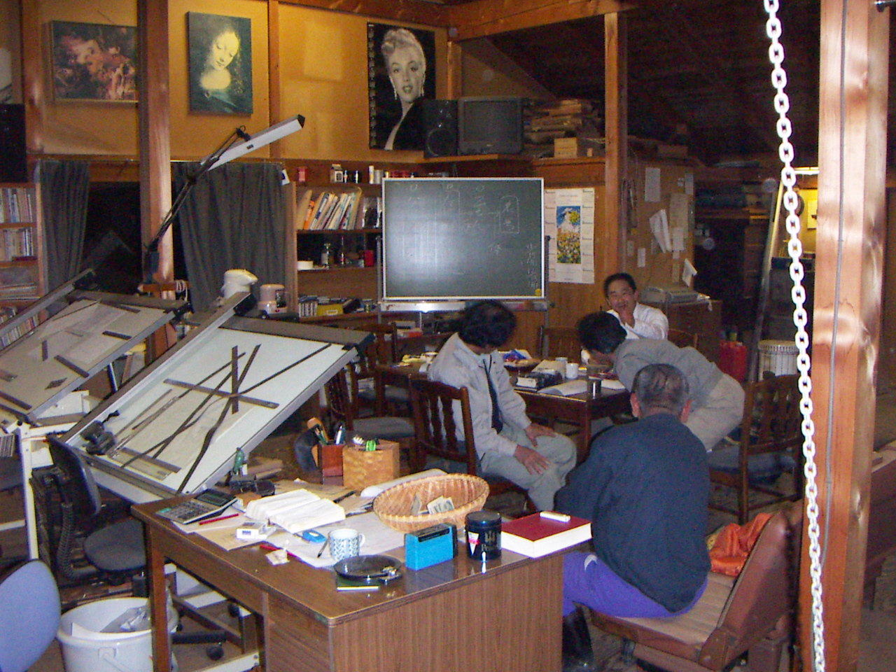 〈美川の会〉の会場風景 【トップページへ】 【フォトギャラリーメニューへ】 講義後の談笑。大工さんの作業場の二階の事務所が集会所になっています。会場の雰囲気がよく出ています。 夜も更けてゆくと、一人帰り二人帰り、 こんな時にいろいろとおもしろい話が飛び出したります。