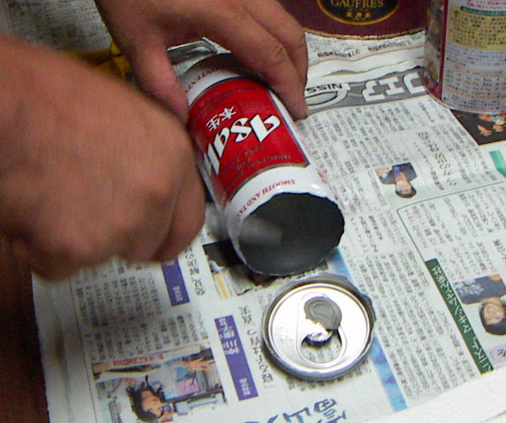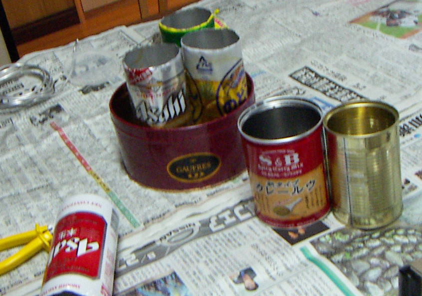 | ◆9月11日の「メモリアルデー」に使うピースキャン ドルをみんなで作ることになりました。 ◆まずは缶を切ります。アルミの方が 扱い易いそうです。 手を切らないように気をつけて。 |
