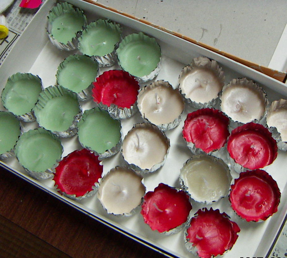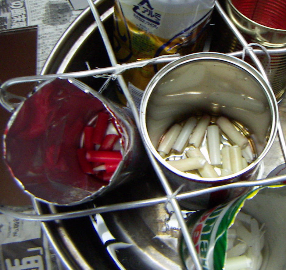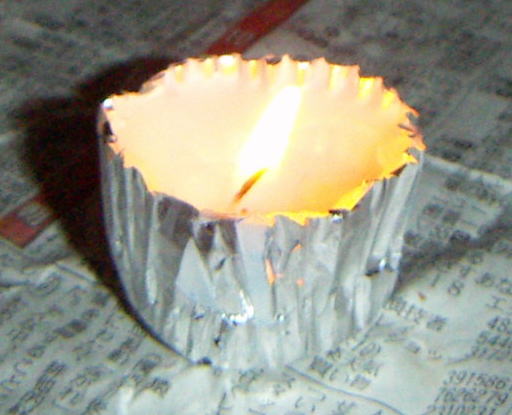 ◆アルミカップに注ぎ込みます。 ◆このとき、芯がまっすぐになるように。 ◆写っていませんが、芯の底の部分は 芯が浮いてこないように、約5ミリ四方の 鉛の板に穴を開け、そこに糸を通して玉結びを してあります。 ◆鉛の板は柔らかいので、はさみで切れます。 ホームセンターに売っています。 |
