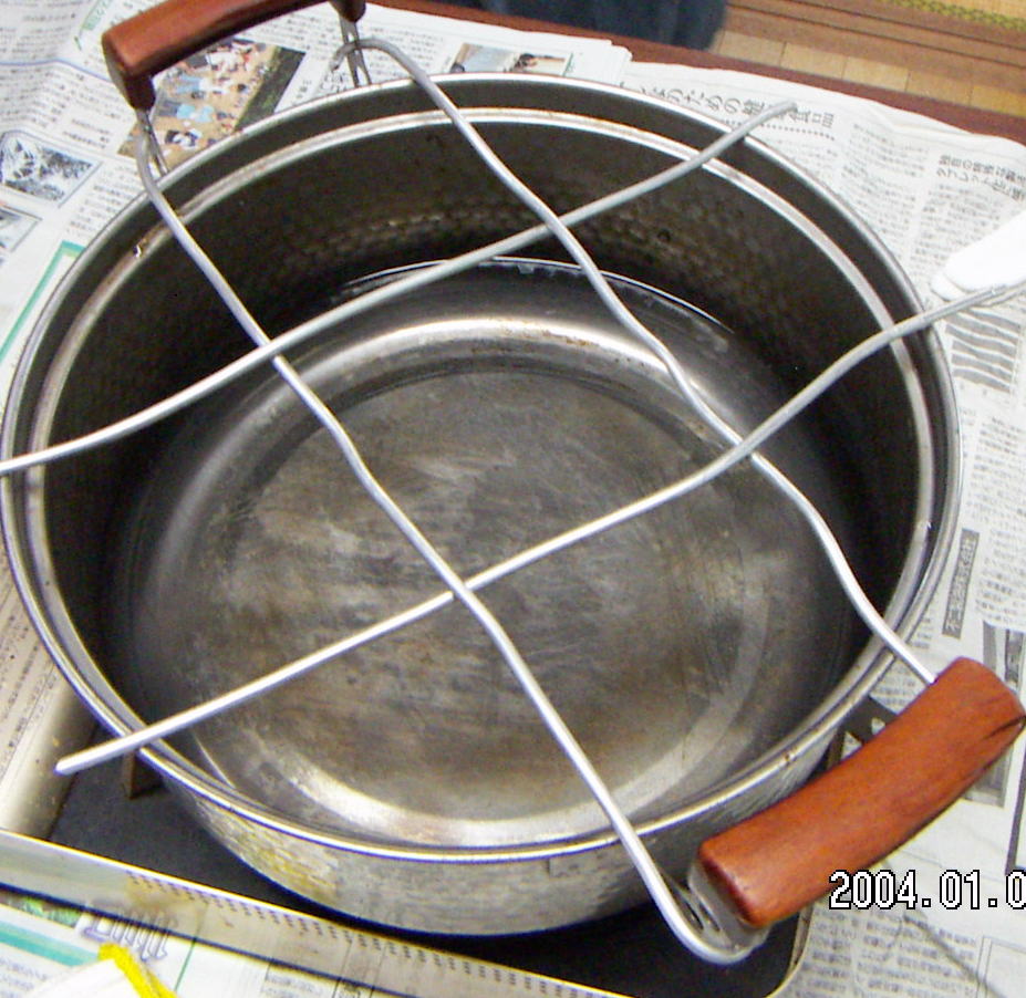 ◆鍋で湯煎する場合には、缶がひっくり返らない ようにこんな風に太くて柔らかい針金で、 仕切りを作ります。 |