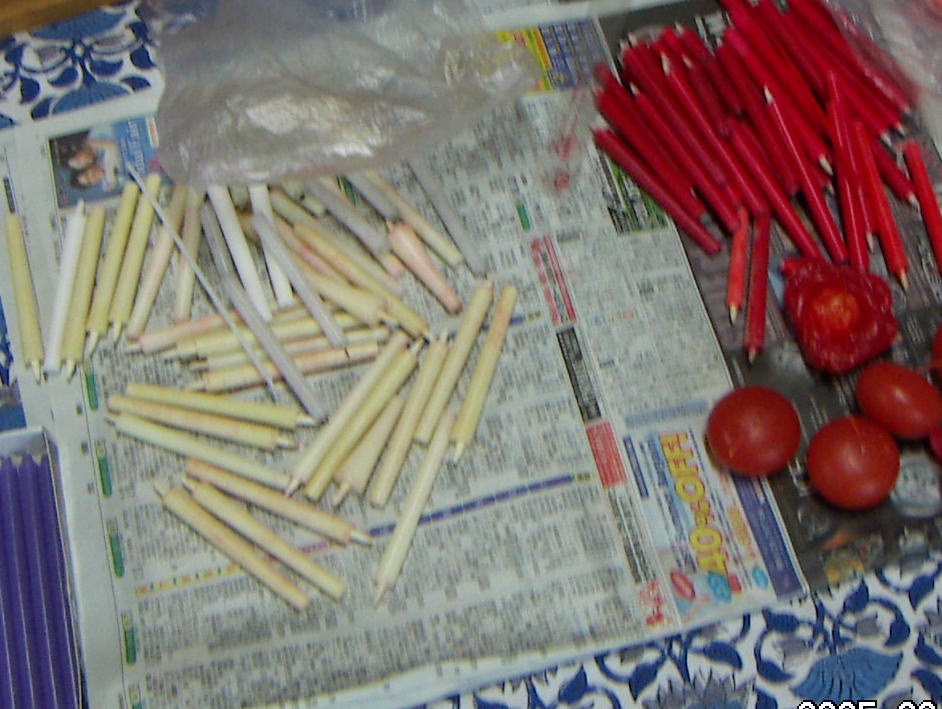 ◆ろうそくは、和ろうそくや洋風のものまで、 どんなものでも構いません。 ◆これをポキポキと折っていきます。 |