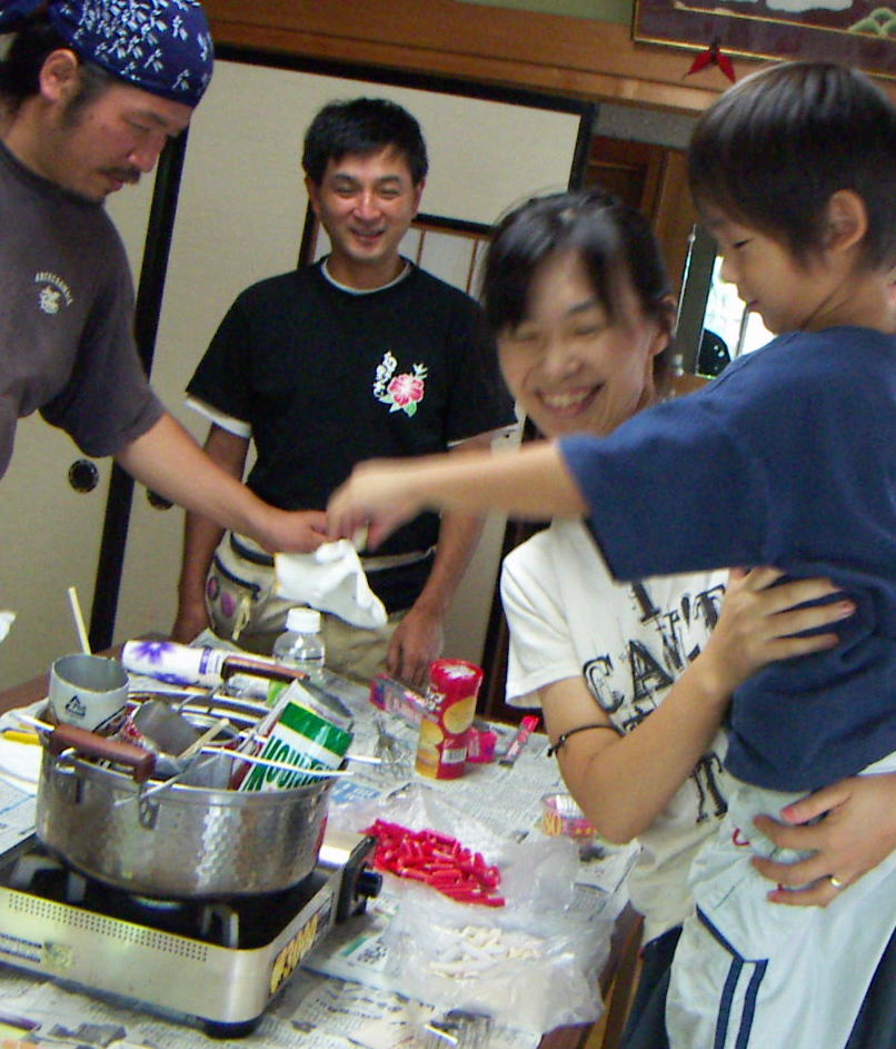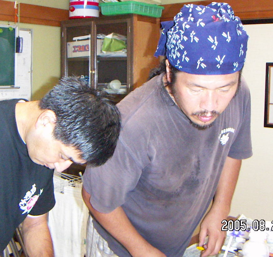 | ◆料理の時より真剣なまなざし? ◆バンダナをしている人が先生です。 |