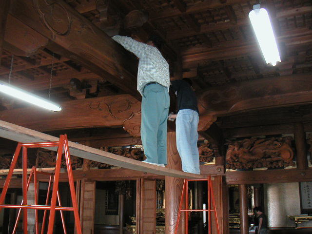 ← → お磨き 磨き終えた仏具はピッカピカ 今年は特に念入りのようでした。 ← → 高場の拭き掃除 3メートルほどの脚立に板を渡して、高いところの拭き掃除。 大掃除の後は、門徒総会 →