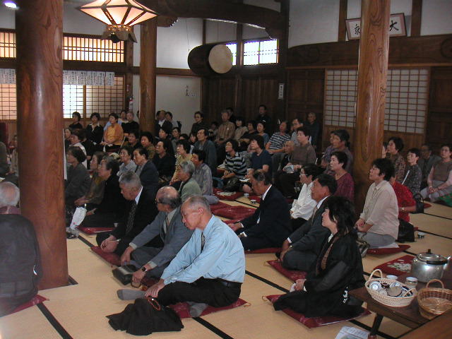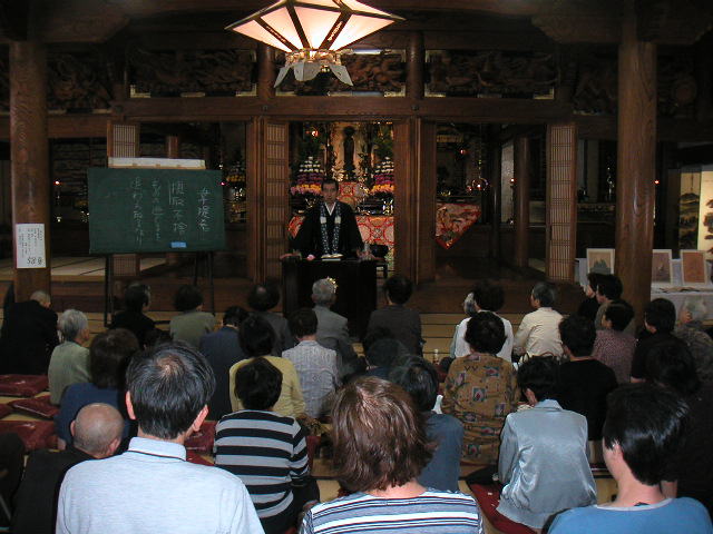 常 讃 寺 報 恩 講 聞 法 2003年10月12日 熱のこもったお話に耳を傾けています。 大谷大学助教授の 一楽 真 さんに来ていただきました。
